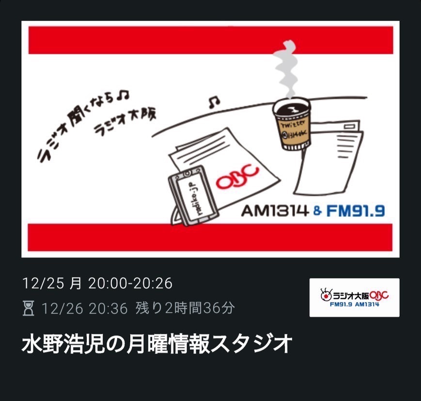 Radiko(https://radiko.jp/#!/ts/OBC/20231225200000)で、タイムフリー視聴ができます!