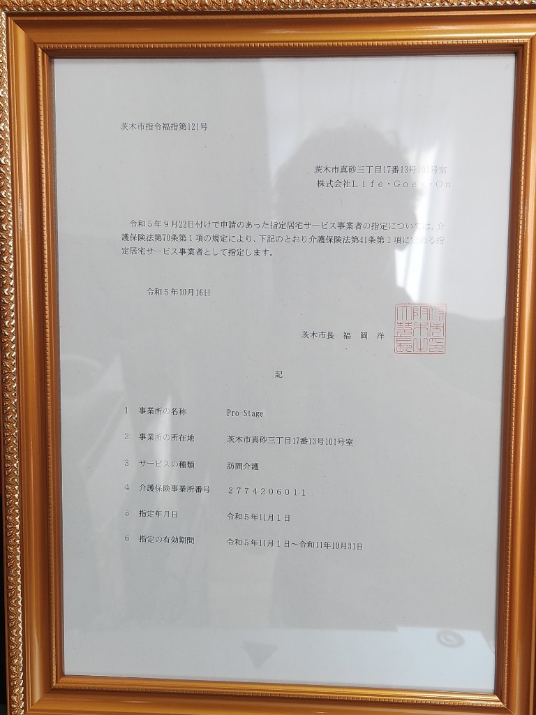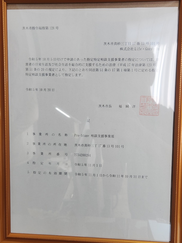 さて、私どもPro-Stageは、2023年11月1日付けで茨木市の指定特定相談支援事業と介護保険事業の指定を受けることができました。